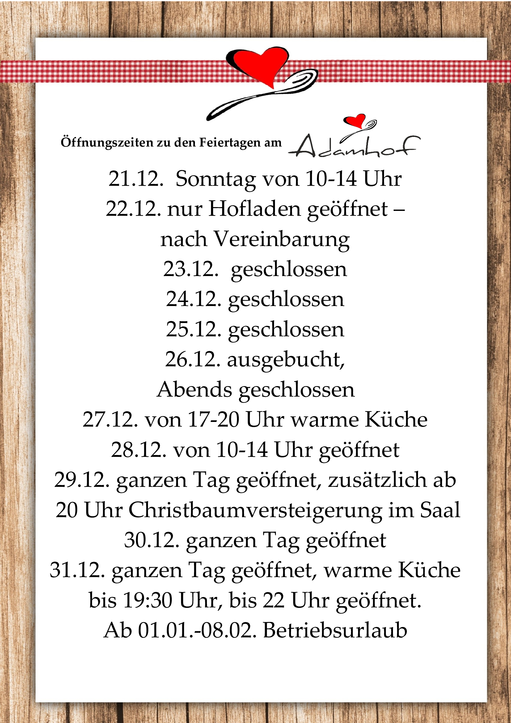 Öffnungszeiten zu den Feiertagen und Jahresurlaub